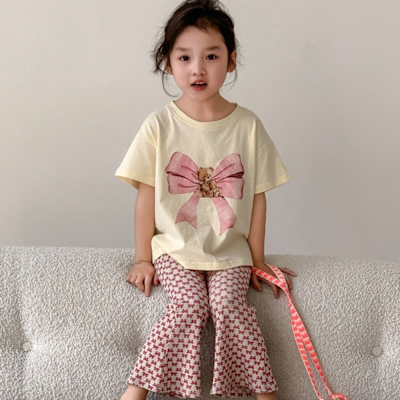 Baby童衣 兒童短袖套裝 女童夏季蝴蝶結上衣+粉格紋套裝 89119