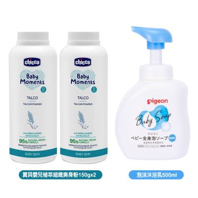 【Chicco】寶貝嬰兒植萃細緻爽身粉150gx2罐+Pigeon泡沫沐浴乳500ml$985