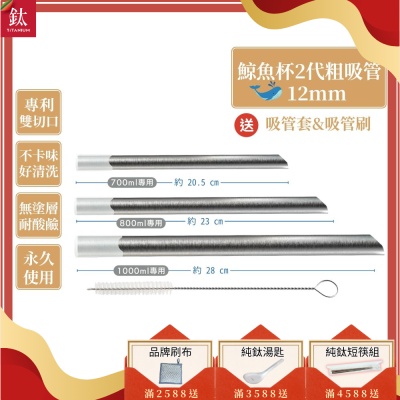 TiKOBO鈦工坊 專利雙切口19.8cm環保純鈦吸管8+12mm粗細套組(贈收納袋+清潔刷+吸管矽膠套)(快)