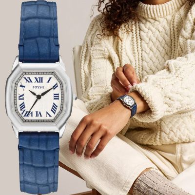 FOSSIL 甜美風格款錶框鑲鑽皮革錶帶手錶(ES5295)-銀色面x藍色系/28mm