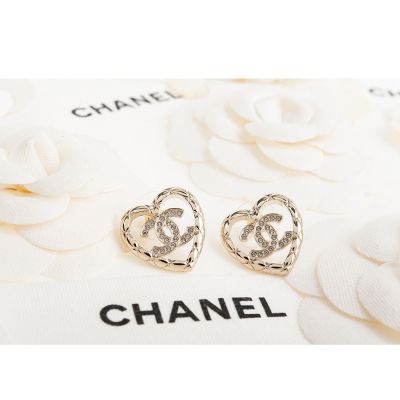CHANEL 香奈兒 新款縷空格紋愛心CC LOGO水鑽貼耳針式耳環 (淡金)