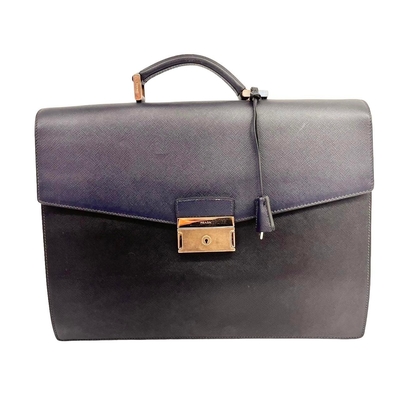 展示品 9成新 PRADA公事包全牛皮革(深藍拚黑色)