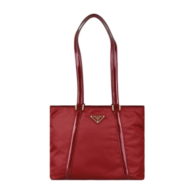 PRADA 普拉達 燙金三角牌LGOO防水尼龍拉鍊肩背購物袋(火紅)