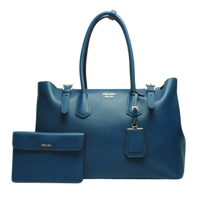 PRADA 普拉達 Saffiano系列金屬立體LOGO小牛皮手提子母包(藏藍x紅-附萬用小袋)$84,28086折