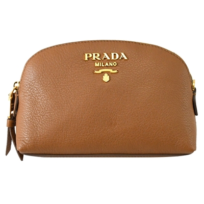 PRADA 金屬LOGO荔枝牛皮貝殼造型拉鍊萬用包/化妝包(焦糖棕)