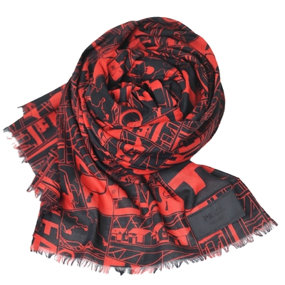 PRADA 義大利製100%棉繽紛圖騰品牌字母LOGO布標造型多用途披肩長方巾(黑紅系)