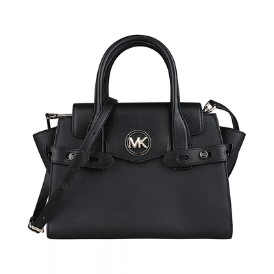 MK MICHAEL KORS CARMEN 縮寫金字LOGO十字紋防刮牛皮拼滑面牛皮釦式手提斜背包(中/黑)