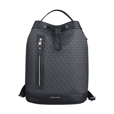 MICHAEL KORS HUDSON銀字字母LOGO PVC拼接牛皮抽繩束口後背包(黑x炭灰)