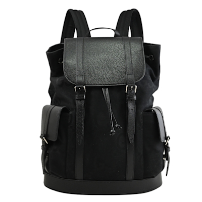 GUCCI 古馳 經典GG LOGO印花尼龍牛皮陪襯雙口袋釦式翻蓋束口後背包(黑)