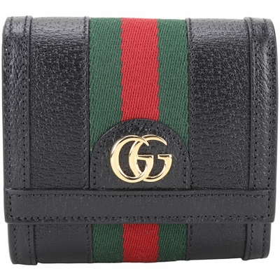 GUCCI 古馳 Ophidia GG 紅綠織帶壓紋牛皮釦式短夾(黑色)