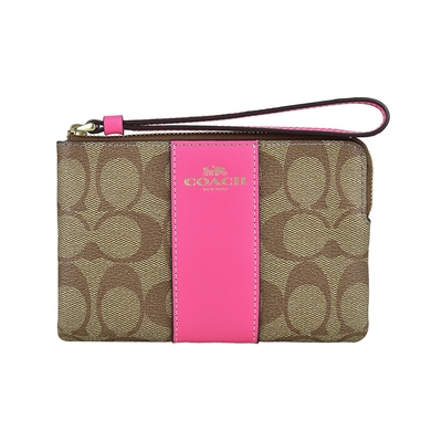 COACH馬車LOGO字母印花PVC搭牛皮拉鍊手拿包(卡其棕x罌粟粉)
