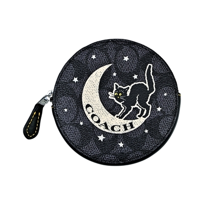 COACH萬聖節限定墨黑灰C LOGO星月貓咪圖印圓餅零錢包