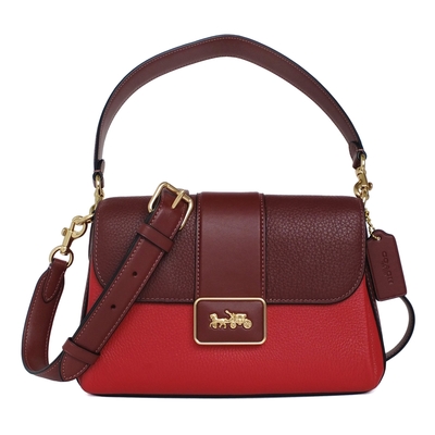 COACH酒紅拼色全皮馬車方釦翻蓋肩背/斜背兩用包