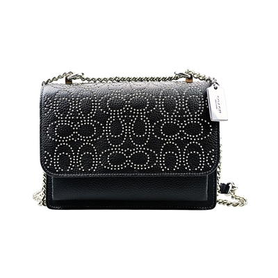 COACH KLARE黑色荔枝紋全皮飾銀色鉚釘C LOGO內雙層鍊帶方型斜背包