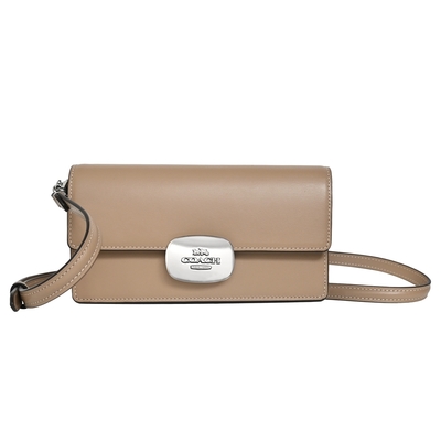 COACH ELIZA奶茶色素面全皮橢圓銀釦翻蓋橫式手抓斜背包
