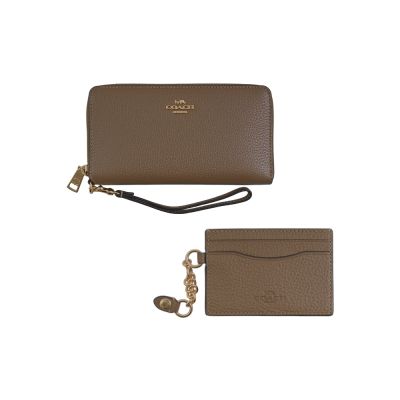 COACH 灰褐色荔枝紋皮革附活動卡夾皮革手掛帶拉鍊長夾$4,48078折