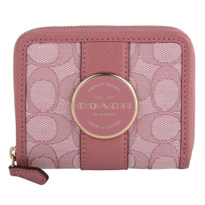 COACH 鐵牌圓標馬車緹花織布ㄇ型拉鍊短夾(橘粉X粉)