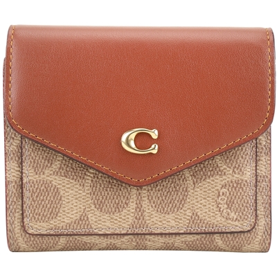 COACH Wyn C字拼接老花塗層帆布三折信封釦短夾(紅棕色)