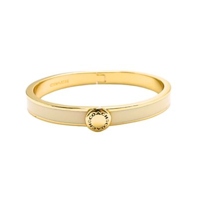 - 美國直送最新飾品COACH金色圓牌LOGO水鑽點綴象牙白細版扣式手環$1,480