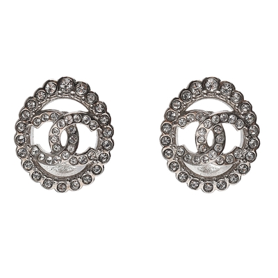 CHANEL 經典點點雕刻雙C LOGO造型水鑽鑲嵌穿式耳環(銀色)
