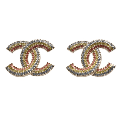 CHANEL 經典三色水鑽大雙C LOG造型穿式耳環(金色)