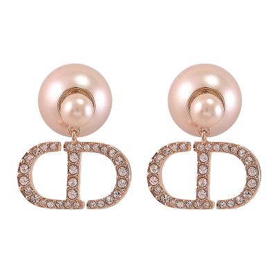 Christian Dior CD Navy 經典CD LOGO水鑽垂墜珠飾針式耳環(玫瑰金)