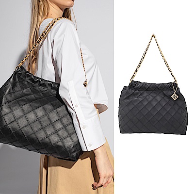 TORY BURCH Fleming Hobo菱格雙鍊帶小牛皮手提 肩背流浪包(黑色)