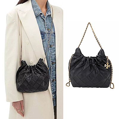 TORY BURCH Fleming Hobo 雙鍊帶菱格納帕皮革手提 斜背流浪包(黑色)