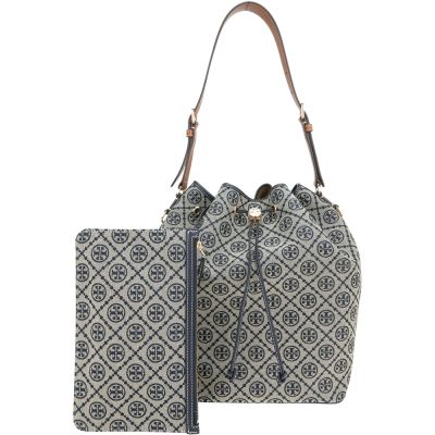 TORY BURCH T Monogram 大款 雙T緹花布拼牛皮撞色肩背水桶包(附萬用包/海軍藍)