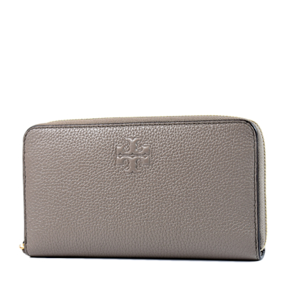 TORY BURCH THEA 浮雕LOGO荔枝紋拉鍊長夾-灰色/附活動卡夾