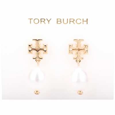TORY BURCH Kira 雙T金屬珍珠綴飾穿針式耳環(金色)