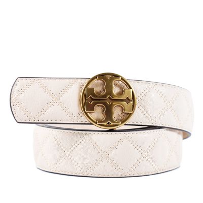 TORY BURCH Willa雙T圓標菱格雙面用寬版皮帶-象牙米-S