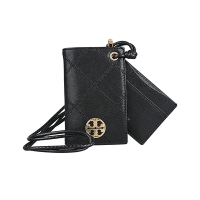 TORY BURCH Willa經典金色圓牌LOGO菱格紋皮革掛繩卡片夾(黑)