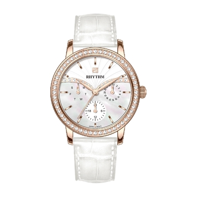 RHYTHM日本麗聲 優雅奢華氣質淑女三眼設計真皮腕錶-玫瑰金/42.5mm
