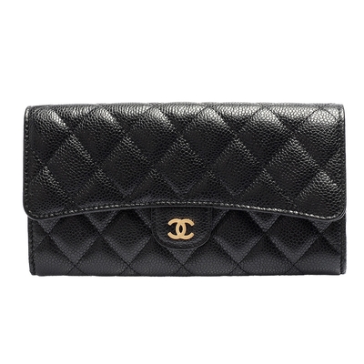 CHANEL香奈兒 經典金色雙C LOGO菱格粒紋牛皮暗釦長夾(黑色)$62,8209折