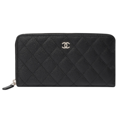 CHANEL香奈兒 經典銀色雙C LOGO菱格粒紋牛皮拉鍊長夾(黑色)$62,8209折