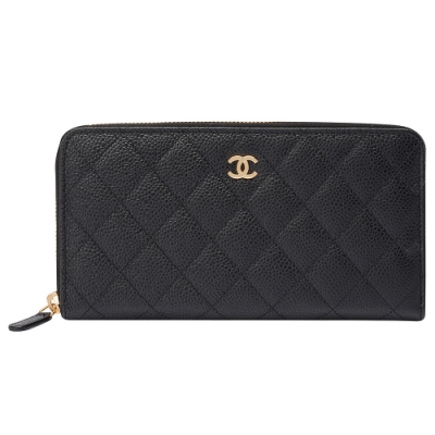 CHANEL香奈兒 經典金色雙C LOGO菱格粒紋牛皮拉鍊長夾(黑色)$62,8209折