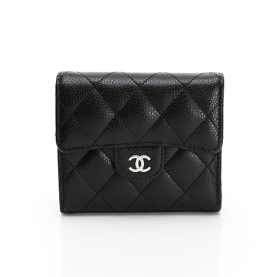CHANEL香奈兒 經典銀色LOGO菱格紋荔枝紋牛皮釦式短夾(黑)$53,000