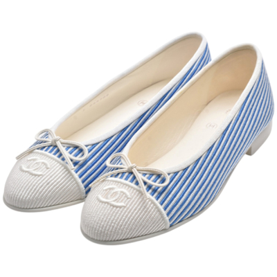 CHANEL 經典雙C LOGO蝴蝶結裝飾直條紋低跟娃娃鞋(藍色)$22,07289折