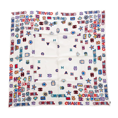 CHANEL香奈兒 手繪塗鴉風多圖案方巾(白底/多色圖案)$16,82189折