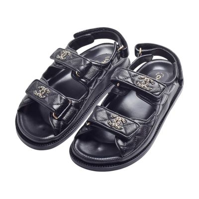 CHANEL 雙C金屬LOGO格紋寬版涼鞋(深藍-36號)$54,91389折