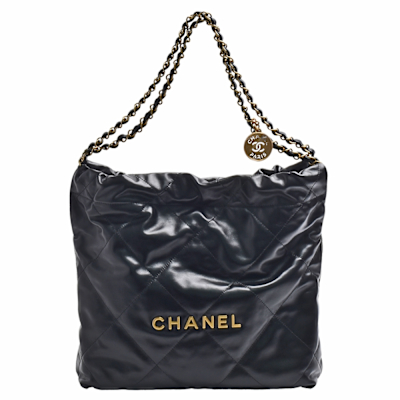 CHANEL 經典22系列品牌LOGO菱格紋縫線小牛皮金鍊肩背包(大-深藍色)$233,8209折