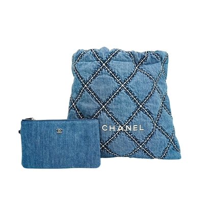 CHANEL 香奈兒 22 銀logo菱格紋單寧牛仔肩背包-中(AS3261-藍)$179,06889折
