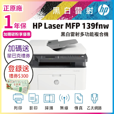 HP Laser MFP 139FNW 黑白雷射傳真多功事務機 (A0NU1A)《加碼送星巴克咖啡禮券》$9,488