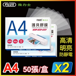 【優選特惠組】FILUX 飛力士 高清明亮防靜電A4護貝膠膜 (50張/盒X2,共100張)