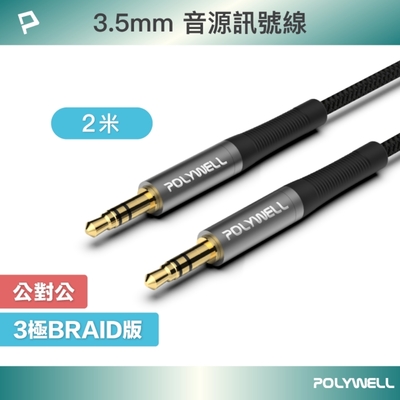 POLYWELL 3.5mm AUX音源線 公對公 2M 3環4節 4極 鋁合金外殼 編織版$13983折