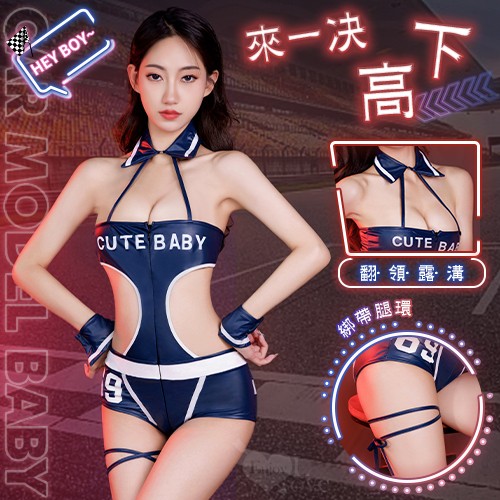 【賽車女郎】辣妹裝 夜店服 雙頭拉鍊設計裸腰透紗露臀可開襠連身衣三件組 E536029