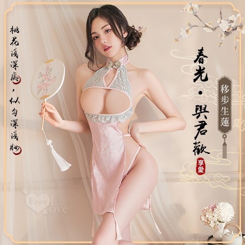 性感睡衣 情趣旗袍!古典立領盤釦滑嫩香肩鏤空雪乳連身裙兩件組 E535736