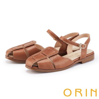ORIN 寬版編織護趾真皮平底涼鞋 棕色