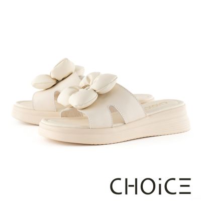 CHOiCE 雲朵澎澎花朵牛皮一字厚底拖鞋 米色